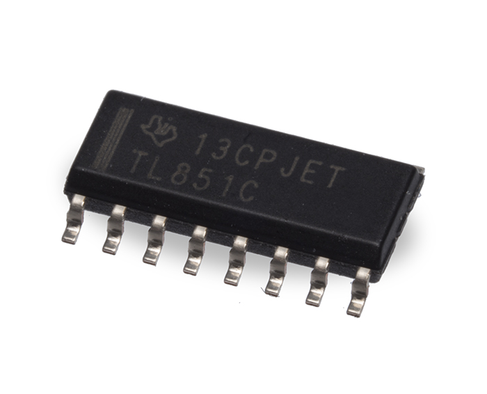 Black integrated circuit chip labeled TL851C with fifteen metal pins, shown angled on a white background.PID 614903LF – Digital IC Chip TL851CD – SMT